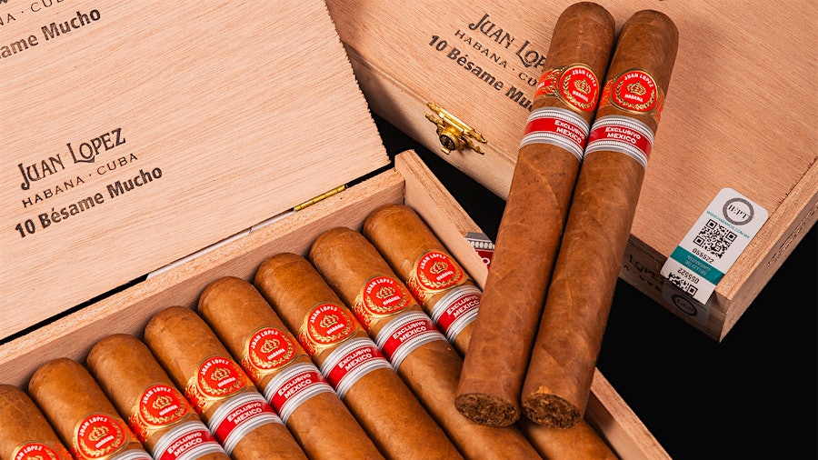 Os rótulos secundários da caixa e da anilha, que trazem a inscrição “Exclusivo Mexico”, identificam o charuto Juan Lopez Bésame Mucho como uma Edição Regional.